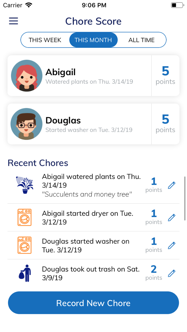 Track completed chores, adjust point values for each chore completed, and see who has the highest Chore Score out of the members in your household.